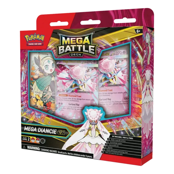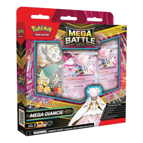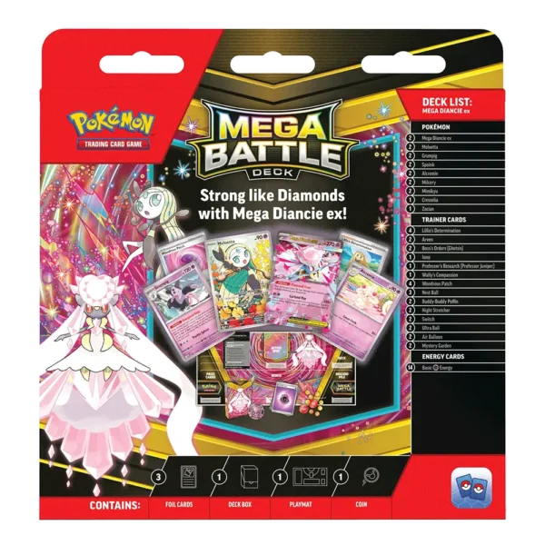 Entra directo al combate con este Mega Battle Deck de Mega Diancie ex, una opción diseñada para jugadores que buscan comenzar con una baraja sólida, visualmente atractiva y lista para competir desde el primer turno. Con una combinación equilibrada de estrategia y potencia, este deck te permite desplegar todo el brillo de Diancie en el campo de batalla sin necesidad de construcción previa.