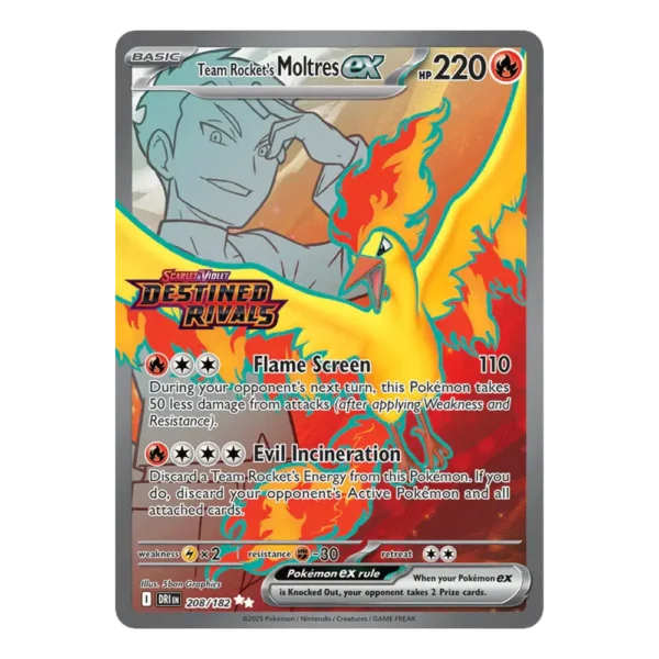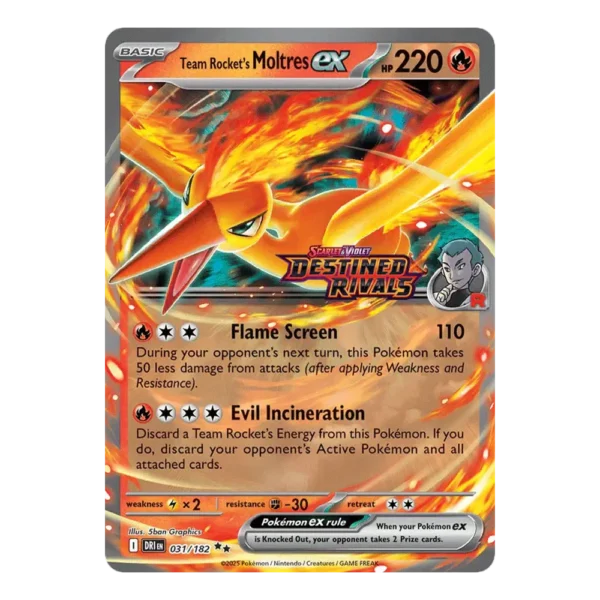 ⚡ Poder que domina el combate. Moltres ex despliega una ofensiva intensa, creando presión constante sobre el rival mientras mantiene presencia en el campo. Es una carta que combina impacto visual con capacidad estratégica.